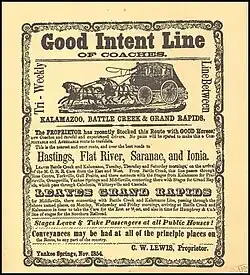 By the early 1840s stages over this road were carrying passengers between Battle Creek and Grand Rapids. By the late 1840s Patterson & Ward (W. G. Patterson of Kalamazoo and John K. Ward of Battle Creek) provided stagecoach service. By late 1854 the Good Intent Line (C. W. Lewis, proprietor) was providing stagecoach service between Battle Creek and Kalamazoo, at one end, and Grand Rapids, with the Battle Creek and Kalamazoo routes merging at Richland. Beginning in the 1840s, stagecoaches also operated from Battle Creek north to Hastings, west to Middleville, and on to Grand Rapids along the same route. All of this traffic passed through Whitneyville, and most or all of it presumably stopped at Whitney's tavern.