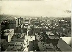 ![]() Aerial perspective of the Wholesale District looking south down Meridian Street from the Soldiers' and Sailors' Monument (2015) | |