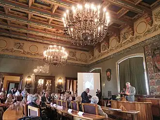 In 1864 the palace was purchased by the Municipality of Kraków. According to Resolution of the City Council the building restoration was carried out based on design by architect Paweł Barański from 1865 to 1868. In the second floor renovations, a brand new Council Chamber was created for the city. Furniture was designed by architect Filip Pokutyński. The upper parts of the walls of the hall were decorated with carved busts of the Polish kings. A new gallery of portraits of presidents of the city was launched, placing them on the walls of the hall. Municipal offices and the office of Mayor were located on the first floor.[1]