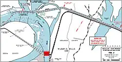 The course of the lower Arkansas River changes significantly downstream from the location of the dam, where the river follows a long winding route until it reaches its outflow at the Mississippi River, approximately 25 mi (40 km) southeast. This circuitous portion of the Arkansas River between the current dam location and the Mississippi River was historically bypassed by river vessels; early steamboats instead followed a network of rivers—known as the Arkansas Post Canal—which flowed north of the lower Arkansas River, and followed a shorter and more direct route to the Mississippi River. When the McClellan–Kerr Arkansas River Navigation System was constructed between 1963 and 1970, the Arkansas Post Canal was significantly improved, while the lower Arkansas River continued to be bypassed by river vessels. For this reason, the dam was erected with no lock facilities because the waters downstream of the dam were used only by small recreational boats. Access to the Arkansas Post Canal is 2.5 mi (4.0 km) northwest of the Wilbur D. Mills Dam.[3]
