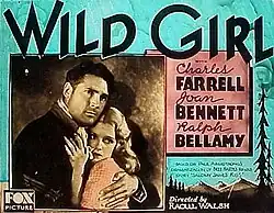 Wild Girl is a 1932 American pre-Code historical drama western film directed by Raoul Walsh and starring Charles Farrell, Joan Bennett, Ralph Bellamy, and Eugene Pallette. The film was based on a play by Paul Armstrong Jr.,[1][2][3] which in turn was based on the 1889 short story, Salomy Jane's Kiss, and 1910 novel, Salomy Jane's Kiss, by Bret Harte. The story had been previously filmed as Salomy Jane (1914) and Salomy Jane (1923).[4]