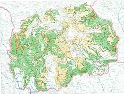 North Macedonia spans 25,713 square kilometres (9,928 sq mi) in the middle of the Balkan Peninsula.[1] The landlocked country is centred around the Vardar river valley, with the national borders being marked by mountain ranges.[2] Its diverse landscape creates a variety of local climates, which can be divided into eight biomes. The varied habitats of the country, including both natural and man-made environments, can be divided into 28 broad types,[1] which are further subdivided into 120 at the third level of EUNIS classification. These are spread across 38 classes of landscapes.[3]