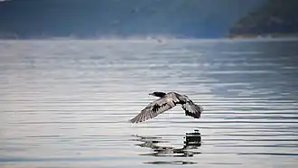 North Macedonia contains 477 square kilometres (184 sq mi) of surface water. Its 35 rivers fall into three river basins, with one basin each flowing into the Aegean Sea, the Adriatic Sea, and the Black Sea. The majority of the country, 22.075 square kilometres (8.523 sq mi), falls within the Agean Basin, which contains Lake Dojran. 20.661 square kilometres (7.977 sq mi) of this basin is covered by the Vardar river and its tributaries. The remaining 1.649 square kilometres (0.637 sq mi) of the Aegean drainage basin is covered by the Strumica river and its tributaries. The main river of the 3.359 square kilometres (1.297 sq mi) Adriatic basin is Black Drim, which begins at Lake Ohrid. Lake Prespa also falls within this basin.[2] Under some accounting there are also three minor drainage basins, which combined cover just over 1% of North Macedonia.[3] Altogether, lakes cover 2% of the country, about 500 square kilometres (190 sq mi). The three large lakes mentioned above are tectonic lakes. Lake Ohrid is 348.8 square kilometres (134.7 sq mi), and has an average depth of 144.8 metres (475 ft).[1] It is thought to be 2–3 million years old.[3] Lake Prespa is 274 square kilometres (106 sq mi), with an average depth of 18.8 metres (62 ft). Lake Dojran is 43 square kilometres (17 sq mi), with a maximum depth of just 10 metres (33 ft). These three lakes are split between North Macedonia and neighbouring countries. Around 43 glacial lakes exist in the mountains. There are also 111 are artificial lakes, including large reservoirs.[1]