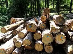 The estimated wood mass in the country was 74,343,000 cubic metres (2.6254×109 cu ft) in 2008.[6] Forested land expanded by 3.5% in the decade leading up to 2013, reflecting a decrease in annual logging, deliberate efforts to expand forested area, and a reduction in livestock. This recovery is not shared by all forest types however, with coniferous and mixed forest coverage reducing in size. As of 2013, 58% of the forest was deciduous, 30% was mixed, 7% was coniferous, and 5% was considered degraded. Some deliberate forestation has been undertaken with the invasive Robinia pseudoacacia and Ailanthus altissima.[1]
