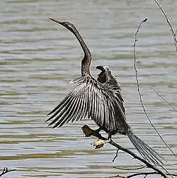 Darters are often called "snake-birds" because of their long thin neck, which gives a snake-like appearance when they swim with their bodies submerged. The males have black and dark-brown plumage, an erectile crest on the nape and a larger bill than the female. The females have much paler plumage especially on the neck and underparts. The darters have completely webbed feet and their legs are short and set far back on the body. Their plumage is somewhat permeable, like that of cormorants, and they spread their wings to dry after diving. There are 4 species worldwide and 1 species which occurs in Thailand, the Oriental darter (Anhinga melanogaster). This near threatened species was sighted in Phitsanulok in 2006 and 2007.[6][8]