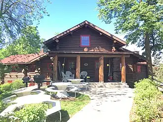 The Wilford H. Fawcett House is a house in Breezy Point, Minnesota, United States, listed on the National Register of Historic Places. Wilford H. Fawcett, also known as "Captain Billy", started the book "Captain Billy's Whiz Bang" as a joke book for soldiers during World War I. He formed Fawcett Publications in 1919 in Robbinsdale, Minnesota. In 1920, he bought a tract of land where the present-day Breezy Point Resort is located, and he began building cottages and a large log lodge.[2][3] The lodge has since burnt down. He built the Fawcett House as a private residence within the resort property. Fawcett hired the Minneapolis architects of Magney and Tusler and commissioned the design in the Swiss Chateau style. The rustic log style was a bit ironic, since the local logging industry had declined before the resort was built.[4] The house is located on a point on Breezy Point Bay on Big Pelican Lake. It has a "Y" shape. The center of the "Y" has a circular staircase leading to a "reading balcony" in the main hall. The building is constructed of peeled and trimmed Norway pine logs, with brown stain on the exterior and varnished on the interior. The center hall contains the "reading balcony", a large stone masonry fireplace, exposed logs for the rafter beams, and wrought iron fixtures. The remainder of the house has room for about 30 guests. In 1979, a fire damaged several rooms in the northwest wing, but the exterior was unharmed. While the interior has been modernized somewhat, it remains sympathetic to the original.[4]
