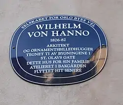 Wilhelm von Hanno was born in Hamburg, Germany. Wilhelm's father, music teacher and librarian Johann Carl Hübner (born 1790), was a native of Königsberg and later took the additional name von Hanno.[2] Von Hanno was educated at Die Hamburgische Gesellschaft zur Beförderung der Künste und Nützlichen Gewerben in Hamburg between the years 1840–43. German-born architect, Heinrich Ernst Schirmer was appointed the construction manager for the restoration of Oslo Cathedral but when he became ill, in 1850, von Hanno came to Oslo and was retained complete the project.[3]