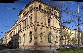 The Gymnasium was founded in 1559 by Duke Albrecht V of Bavaria as a "Paedagogium", but was renamed in 1849 after its probable sponsor, Duke Wilhelm V Up until the suppression of the Jesuits in 1773, the Gymnasium was overseen by the Jesuits ("Jesuit Gymnasium"). Although the Jesuits were later restored, the gymnasium became a state-run institution from that time forth. The present building on Thierschstraße (corner of Maximilianstraße) was erected in 1879 in Neo-Renaissance style. In 1893, it was granted Seminarschule status, meaning it accepted trainee teachers.[4]