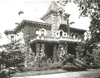 In 1867, Wilkins married Harriet Dawkins Cleveland (1843–1930) of Greenville, a woman wealthy in her own right; and in 1875 they settled in her hometown. On 93 acres Wilkins built a two-story brick mansion in the Italianate style, reflecting their prominence in the business and social life of the community. An 1898 publication described the house as "the finest home of any man in northern South Carolina."[4] The elegant interior, decorated in high Victorian style, included large crystal chandeliers, bas-relief carvings, and an impressive curved staircase. A conservatory on the north side was crowded with plants and flowers.[5] Even after the death of her husband and only son, Mrs. Wilkins (thereafter always dressed in black) continued to play the grand lady, hosting luxurious dinner parties and being driven to social appointments in an enclosed carriage.[6]
