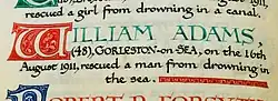 He was honoured on numerous occasions in recognition of his outstanding life saving record. In 1906 the mayor of Great Yarmouth presented William Adams with an illuminated address. The testimonial, signed by 90 subscribers, stated that he had saved 77 lives up to that time.[7]