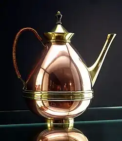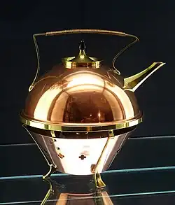 By 1880 he had opened a small workshop in North End Road, Fulham making furniture for Morris & Co.[3][5] A year later the company employed John Lovegrove, a skilled brass and copper-worker, and Benson moved into the design of metal work including fire screens and fenders, tableware, kettles, urns and light fittings.[3] The success of the company saw them move to a new factory at Eyot Works, St Peter's Square, Hammersmith, a foundry in Chiswick and opening a showroom at Camden Hill Square in Kensington during 1883.[3][6][4]