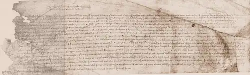 Bonville was absent from England for slightly over two years and returned in April 1445. During his absence, Courtenay had become increasingly powerful in Devon. The King, though, was revealing himself to be a weak-willed monarch, unwilling—or unable—to impose the King's peace in the south-west, or, for that matter, elsewhere. Henry was under the influence of his favourite, William de la Pole, Duke of Suffolk,[8] and Suffolk's government could not afford to alienate the Earl of Devon. Conversely, Suffolk was still an attractive ally for Bonville against the Earl,[59] as Bonville's Lincolnshire associate[60] and later son-in-law, Tailboys, was closely linked with Suffolk.[2][6][note 14] Suffolk's policy was one of trying to keep both Bonville and Courtenay happy.[62] Bonville's newly-acquired political proximity to Suffolk brought benefits. In 1444 Bonville joined the duke's retinue to France, where Bonville played a central role in the betrothal ceremony between King Henry and his bride-to-be, Margaret of Anjou. By a writ of 10 March the following year[63] Bonville was elevated to the peerage.[6] This was both in recognition of his successes in France[59]—it had been a "turbulent period" in Gascony[64]—but also a reflection of the esteem Suffolk held him in.[59] As Baron Bonville of Chewton; he was summoned to every parliament until the end of his life as Willelmo Bonville domino Bonville et de Chuton.[6] In 1446 Bonville suppressed a revolt in Somerset, in which Wells Cathedral was attacked by "insurgents against the peace of the Church and the King".[2]