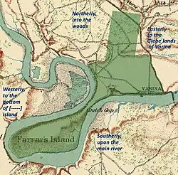 The patent covered a peninsula formed by meander loop, or curl,[55] of the James River subsequently known as Farrar's Island, describing it as abutting the glebe lands of Varina in the east, and extending to the James River in the south, the end of the island (i.e., peninsula) in the west, and "to the woods" in the north.[50] Farrar's Island remained with the Farrar family until 1727 when his great-grandson William Farrar IV sold it to Thomas Randolph.[56][57]