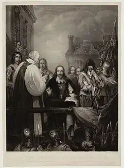 From about 1834 Fisk took to painting the large historical compositions, for which he became best known. He took care to obtain contemporary portraits and authorities for costume, which he faithfully reproduced on his canvases. Some of them were engraved, and were popular. They comprised Lady Jane Grey, when in confinement in the Tower, visited by Feckenhain (British Institution, 1834); The Coronation of Robert Bruce (Royal Academy, 1836); La Journée des Dupes (Royal Academy, 1837); Leonardo da Vinci expiring in the arms of Francis I (Royal Academy, 1838); The Chancellor Wriothesley approaching to apprehend Katherine Parr on a charge of heresy, and Mary, widow of Louis XII of France, receiving Charles Brandon, Duke of Suffolk, ambassador from Henry VIII (British Institution, 1838); The Queen Mother, Marie de' Medici, demanding the dismissal of Cardinal Richelieu (British Institution, 1839); The Conspiracy of the Pazzi, or the attempt to assassinate Lorenzo de' Medici (Royal Academy, 1839), which was awarded the gold medal of the Manchester Institution for the best historical picture exhibited in their gallery in 1840.[1]