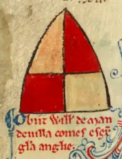 ![]() Inverted shield with the arms of William de Mandeville, count of Essex, indicating his death | |