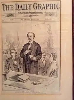 Prominent cases in the 1870s made Fullerton a minor national celebrity. First, as a member of the defense team in the 1873 trials of "Boss" Tweed, his involvement in an effort to persuade Judge Noah Davis to recuse himself on grounds of prejudice led to Fullerton and others being censured and fined, despite Fullerton's presentation at a hearing that The New York Times would call "[one] of the most impressive proceedings ever witnessed in this city."[5] Francis H. Wellman called Fullerton the "Great American Cross-Examiner" partly because of his four days of cross-examining the orator and religious figure Henry Ward Beecher, in connection with Beecher's 1875 adultery trial.[6] The verbal jousting between Fullerton and Beecher was covered from coast to coast.[7]