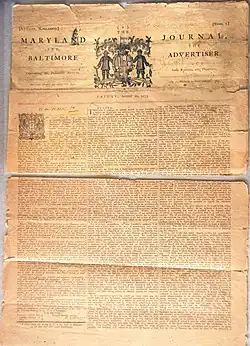 Goddard's Philadelphia business was floundering, so he decided to start over again. He bought the printing equipment and type from the widow of Nicholas Hasselbach, Baltimore's first printer, who had unexpectedly died a few years before.[20][d] He then established Baltimore's first newspapers the Maryland Journal and Baltimore Advertiser, with the first issue on August 20, 1773.[38] The newspapers were printed with the type obtained from Hasselbach.[37] He informed his readers that he would publish all kinds of material of intelligence, foreign or domestic, that would be of interest to the Publick, like notices of the departure of ships, current prices of goods, the course of exchange, accidents, deaths, and events of every kind.[20] Goddard wanted to devote more time to the development of the colonial postal system, so he turned over the management of the Journal to his sister.[20] It was published under her name Mary Katherine Goddard, starting on May 10, 1775.[6][20] It later became a semi-weekly on March 14, 1783. Goddard would again take over the publication of the newspaper on January 2, 1784.[6]
