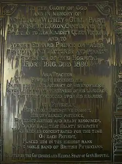 A memorial bronze plaque was placed at the entrance to Guy's Hospital Chapel. The inscription reads: