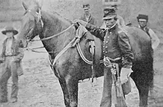 Gibson entered service July 31, 1861, and by August 31 was named Colonel of the Forty-Ninth Regiment, Ohio Volunteer Infantry.[32] Gibson was the 49th Ohio Infantry's commanding officer throughout the U.S. Civil War. In August and September 1861, he organized and trained the 49th Ohio Infantry at Camp Noble, near his home in Tiffin, Ohio. With Gibson in command, the regiment was mustered for three years and fought at 42 Civil War battles including: the Battle of Shiloh, the Siege of Corinth, the Battle of Stones River, the Tullahoma Campaign, the Battle of Chickamauga, the Battle of Missionary Ridge, the Atlanta Campaign, the Battle of Resaca, the Battle of Kennesaw Mountain, the Siege of Atlanta, the Battle of Jonesboro, the Second Battle of Franklin, and the Battle of Nashville.[33][34]