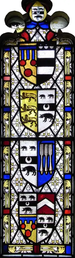 - ^ Arms: trefoil at top: Left: Courtenay boar, one of the Courtenay supporters; right: Bohun swan, one of the Courtenay supporters; centre: Huddesfield arms. Top shield: Courtenay (Or, three torteaux a label of three points azure) impaling Hungerford (Sable, two bars argent in chief three plates), representing the marriage of the parents of Katherine Courtenay, wife of Sir William Huddesfield. 2nd shield down: Carew (Or, three lions passant guardant in pale sable) impaling Huddesfield, representing the marriage of Sir Edmund Carew and Katherine Huddesfield, daughter of Sir William Huddesfield. 3rd shield down: Huddesfield impaling Bosum (Azure, three bird-bolts argent[8]), representing Sir William Huddesfield's first marriage to Jennet or Elizabeth Bosum. Bottom shield: Quarterly 1st & 4th: Huddesfield; 2nd: Fulford (Gules, a chevron argent); 3rd: Courtenay. (incorrect heraldic usage, quartering should only show arms of heiresses)