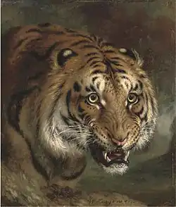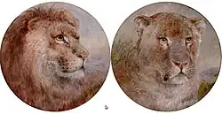 William Huggins was born in Liverpool. His parents were called Samuel and Elizabeth. He received his first instruction in drawing at the Liverpool Mechanics' Institution. He won a prize for "Adam's Vision of the Death of Abel" and successfully entered work to be shown at the Liverpool Academy of Arts whilst fifteen years old.[1] He drew from life using the classes at the Academy of Arts or by sketching the animals in Liverpool's zoo.[1] He travelled further afield to see exotic animals at the unusual Wombwell’s Travelling Menagerie.[5] His animal work was admired and compared to Stubbs. Huggins was magnanimous in acknowledging Stubbs' influence and this contrasts with a later comparison that was made with Landseer where Huggins felt insulted. Huggins pictures of exotic animals were much admired but they are noted for lack of background as Huggins never saw them in their own habitat.[6]