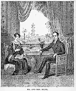 Milne was married to Rachel Cowie, daughter of Charles Cowie, Esq. of Aberdeen, at St. Leonard's on 4 August 1812. They soon departed from Portsmouth for the Cape of Good Hope on 4 September 1812. The Milnes stayed at the Cape of Good Hope with John Campbell for a few days, and they did not arrive in Macau until 4 July 1813. Milne, with his wife and infant child were expelled by the Roman Catholic priests there after three days, and he left for Guangzhou, where he was able to begin study of the Chinese language. His observation regarding the difficulty of an English-speaker acquiring the Chinese tongue has been frequently repeated: