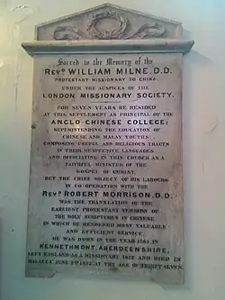 William Milne (April 1785 – 2 June 1822) was the second Protestant missionary sent by the London Missionary Society to China, after his colleague, Robert Morrison.[1] Milne served as pastor of Christ Church, Malacca, a member of Ultra-Ganges Missions, the first Principal of Anglo-Chinese College, and chief editor of two missionary magazines: Indo-Chinese Gleaner (English), and Chinese Monthly Magazine (察世俗每月統記傳). Due to Milne's distinguished role in his missionary field, the University of Glasgow granted him a Doctor of Divinity (D.D.) in 1820.