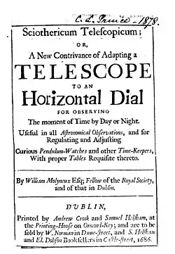 - Sciothericum telescopicum, or A new contrivance of adapting a telescope to an horizontal dial for observing the moment of time by day or night. Dublin: Samuel Helsam. 1686.