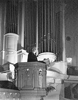 He brought to the pulpit of the academy some of the finest ministers in America: Dean Luther Weigle, Peter Marshall and Ralph Sockman.[14] On December 7, 1941, Peter Marshall, visiting minister from the New York Presbyterian Church of Washington, D.C. asked Thomas if he might change his announced topic. Peter Marshall then delivered a most famous sermon, "Rendezvous in Samarra" [15] about death and immortality to the assembled regiment of Midshipmen. After chapel all were to learn of the attack on Pearl Harbor.[16] Thomas had served on board three ships that were at Pearl Harbor: the USS Pennsylvania the USS Raleigh and the USS West Virginia. Before his sermons, Thomas would honor the members of the Naval Academy graduates who had died in service.[17] In 1943 he received an honorary Doctor of Divinity from American University in Washington, D.C.