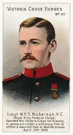 Nickerson was a 25-year-old lieutenant in the RAMC, attached to the Mounted Infantry during the Second Boer War, when his actions at Wakkerstroom during the Siege of Wepener led to the award of the Victoria Cross.[3]