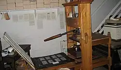 Parks established a print shop in Colonial Williamsburg near the Capitol building on the main street known as the Duke of Gloucester.[4][19] It was the first permanent printing establishment in the colonies and kept the surrounding colonies informed on the latest news. In addition to the Gazette, Parks printed books, pamphlets and tracts. Surviving examples of his work show that his first publications were printed with Dutch type, but were eventually replaced with a better type forged in England by William Caslon.[20][21] While in Williamsburg Parks printed The Laws of Virginia in 1729 for the government of the Virginia colony, along with a work about the history of Virginia.[18][22] During this time he was printing for both the Virginia and Maryland colonial governments, but later ended his service for Maryland in 1733.[22] Later he moved to the print shop familiar today as the tourist attraction on lot 48.[4] It is a two-story building and served as Virginia's post office and Williamsburg's bookshop, stationery store, and book bindery. The Parks family lived above the shop for their home.[23]