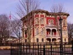 Having no children of their own, in 1852 the Reddicks adopted a child, Elizabeth Barrier Funk.[2][1] In 1855 William Reddick hired architects William B. Olmstead and Peter A. Nicholson to build a large brick home in Ottawa Illinois.[2] Construction occurred 1855–1858 at a cost of $25,000.[7] The brick and stone mansion is in the Italianate style.[1] The house was completed in time for guests to view the first of the Lincoln–Douglas debates from the mansion's steps and balconies on August 21, 1858.[2] A lifelong Democrat, Reddick supported incumbent senator Stephen A. Douglas.[1] During the first of the debates, Reddick sat next to Douglas on the speakers’ platform.[7] Reddick Mansion is one of the largest surviving pre-Civil War homes in the state of Illinois.[1] It is part of the Washington Park Historic District which was added to the National Register of Historic Places in 1973.[8]