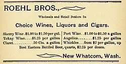 In 1889, the Roehl brothers returned to Whatcom and reopened their business as wine, liquor and cigar merchants. They became leading industry figures of their city, well known for handling high-quality whisky.[7][2][8]