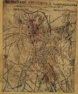 After emerging from their winter quarters at Culpeper on May 3, 1864, Sands and his fellow 88th Pennsylvanians were then assigned to Lieutenant-General Ulysses S. Grant's Overland Campaign, during which they fought in the battles of Spotsylvania Court House (on May 8 and 12), North Anna (May 23), Totopotomoy Creek (May 26), and White Oak Swamp (June 12) before engaging with other Union troops in the Siege of Petersburg, during which time Sands and his regiment charged and routed the enemy from various entrenched positions while under heavy artillery and sharpshooter fire. Afterward, they continued to support siege operations.[20]