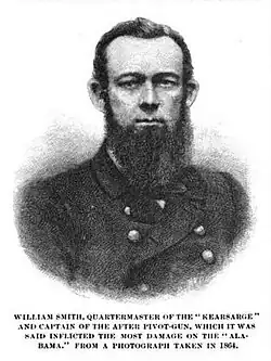 - Served as second quartermaster on board the U.S.S. Kearsarge when she destroyed the Alabama off Cherbourg, France, 19 June 1864. Acting as captain of the 11-inch pivot gun of the second division, Smith carried out his duties courageously and deserved special notice for the deliberate and cool manner in which he acted throughout the bitter engagement. It is stated by rebel officers that this gun was more destructive and did more damage than any other gun of Kearsarge.[1][2]