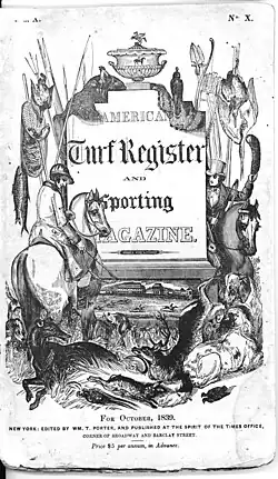 Porter edited the Constellation, a newspaper in New York City that published humorous stories.[3] Porter became interested in sports and concentrated on the emerging sports journalism field. In December 1831, Porter published the first issue of a new newspaper devoted to covering sports and other recreational activities, which he called The Spirit of the Times. Porter imitated Bell's Life in London, a contemporary English publication covering the same subjects. The first attempt at Spirit of the Times failed quickly,[1] and Porter sold the magazine to C. J. B. Fisher, who merged it into Fisher's publication of the Traveller, and the Spirit was combined with the Traveller as the Traveller and Spirit of the Times. During the brief period that Porter operated the Spirit, he employed Horace Greeley as a typesetter. When Porter sold the Spirit, he then went to work at the New-Yorker, which was edited at the time by Horace Greeley. In January 1835 Porter purchased the Traveller and Spirit of the Times and renamed the newspaper back to Spirit of the Times, returning to editing it.[4] This version of the Spirit managed to survive, although with some initial financial difficulties. Porter focused on selling his paper in the south and west of the United States, and emphasized subjects of use to his readers, such as cattle breeding, farm methods, books of interest, as well as sports.[1] The newspaper was published weekly.[5]