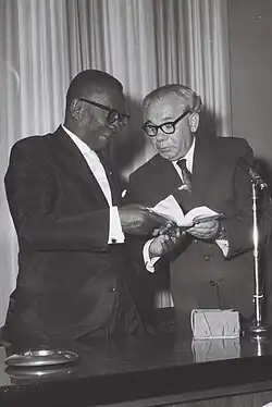 In foreign policy, Tubman aligned his country with the US, which he hailed as "Our strongest, closest, and most reliable friend."[15] In June 1944, he and former president Edwin Barclay traveled to the White House as guests of President Franklin D. Roosevelt, and became the first African heads of state to be received there.[3] Following the war, which resulted in an anti-colonial movement on the African continent, Tubman strengthened ties among fellow Africans by participating in the Asian-African Conference of 1955, and the First Conference of Independent African States in Accra, organized in 1958 by Kwame Nkrumah of Ghana.[16] In 1959, Tubman organized the Second Conference of African States.[17][18]