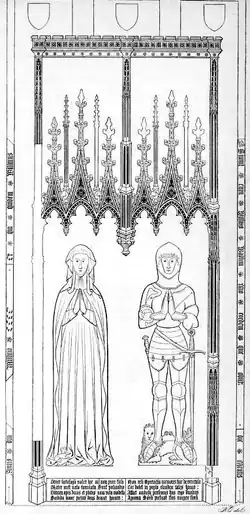 His monumental brass and chest tomb in the Church of St Mary, Ilminster is said by William Henry Hamilton Rogers to depict him with his mother Joan Wrottesley, daughter of Sir William Wrottesley of Blore and Joan Bassett of Drayton Bassett, both in Staffordshire. It is among the best surviving brasses from the fifteenth century, and depicts him in complete plate armour exported to England by Milanese armorers; the finest of the period. His mother is wearing 'widow's weeds'.[4]