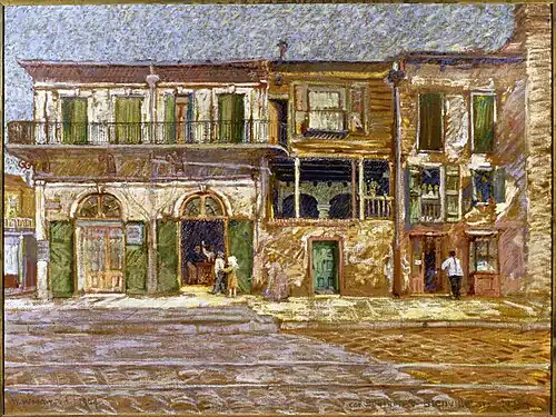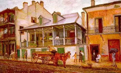 He was the first artist to focus intensely on the Vieux Carré "before it was fashionable," documenting the city's rich cultural heritage in vignettes of daily lifeÑstreet cleaners, milkmaids driving drayage carts, women at market, and residents otherwise engaged in their daily routines. These scenes have been said to "rank as his best of the urban fabric of New Orleans." He assimilated Impressionist tenets with his own style and ultimately developed a manner of artistic rendering suitable for capturing the soft light, moisture, and romantic essence of the French Quarter. His palette lightened and the contours of figures and architecture softened. His figures, which are imbued with a sense of immediacy, enliven his architectural scenes.