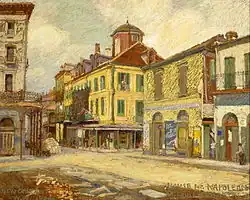 His impression of the multicultural Vieux Carré in a crescent of the Mississippi River provided lifelong artistic inspiration. Unlike the wide-open spaces of his youth, the Quarter was crowded with European-style residences alongside docks, open air markets, dry goods stores, and hardware stores, all located in the shadow of St. Louis Cathedral on the city's main square. His impressionistic views of the Vieux Carré were paramount in focusing attention on the historical structures, many of which were being recklessly destroyed. In 1895, he was in the forefront of the movement against the demolition of The Cabildo, the seat of government during the Spanish Colonial period, rebuilt after the 1794 fire and one of the few surviving structures of the colonial era. This battle for historic preservation in the French Quarter ultimately led to the establishment of the Vieux Carré Commission.