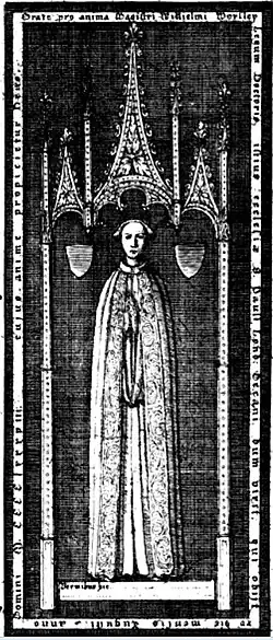 Worsley held the deanery throughout the reigns of Edward V and Richard III, but in 1494 he became involved with the revolutionary movement by Perkin Warbeck. He was arrested in November, confessed before a commission of Oyer and terminer, and was found guilty of high treason on the 14th (Rot. Parl. vi. 489b). The lay conspirators were put to death, but Worsley was saved by his order, and on 6 June 1495 he was pardoned (Gairdner, Letters and Papers, ii. 375).[1] In the following October, the Parliament of England passed an act, the 'Dean of St Paul's (Restitution) Act 1495 (11 Hen. 7. c. 52) restoring him in blood (Statutes of the Realm, ii. 619). He had retained his ecclesiastical preferments, and died in possession of them on 14 August 1499, being buried in St. Paul's Cathedral; his epitaph and a very pessimistic copy of Latin verses are printed by Weever (Funerall Monuments, p. 368; Gough, Sepulchral Mon. ii. 337). Fabyan describes Worsley as ‘a famous doctour and precher’ (Chronicle, p. 685). His will, dated 12 Feb. 1498−9,[2] was proved at Lambeth on 8 Nov. 1499, and at York on 27 March 1500, and is printed in ‘Testamenta Eboracensia,’ iv. 155−6; by it he left money for an obit in St. Paul's.