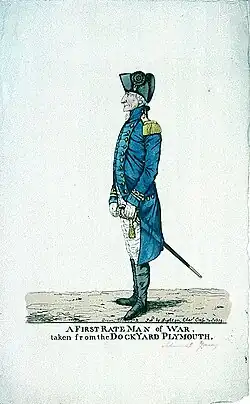 ![]() A First Rate Man of War, taken from the Dockyard Plymouth, an 1809 caricature of William Young while commander at Plymouth, by Robert Dighton | |