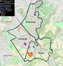 Carolside Primary School is located in the Carolside area. It also has nursery facilities, some of which are currently being extended (as of March 2020). Its catchment covers the large Carolside and South Williamwood areas, as well as the small area of Overlee (not to be confused with the Stamperland park of the same name), as well as most of Clarkston's town centre.