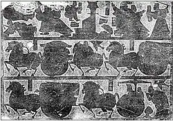 In addition she pointed out that the walls of tombs were constructed of bricks, which influenced the pictorial methods. Potters could stamp a design on any number of bricks and assemble elaborate patterns, which led to superimposed friezes and division into panels, rather than creating an illusion of continuous pictorial space.[25][26]