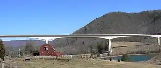 The Wilson Creek Bridge (also known as the Smart Road Bridge) is a cast-in-place cantilever box girder bridge located in Montgomery County, Virginia, built as part of the Virginia Smart Road project. It extends for 1,985 feet (605 m) with three spans of 472 feet (144 m) and two spans of 283 feet (86 m). At 175 feet (53 m) tall, it is the second tallest bridge in Virginia, with the tallest being the Grassy Creek Bridge in Buchanan County at 225 feet (69 m) tall.[1]
