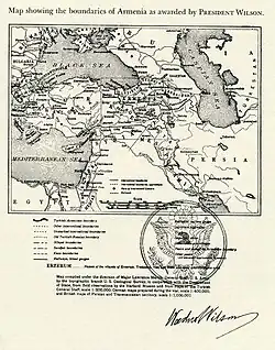 Wilsonian Armenia (Armenian: Վիլսոնյան Հայաստան, romanized: Vilsonyan Hayastan) was the unimplemented boundary configuration of the First Republic of Armenia in the Treaty of Sèvres, as drawn by U.S. President Woodrow Wilson's Department of State.[1]: 40–44 The Treaty of Sèvres was a peace treaty that had been drafted and signed between the Western Allied Powers and the defeated government of the Ottoman Empire in August 1920, but it was never ratified and was subsequently superseded by the Treaty of Lausanne. The proposed boundaries of Wilsonian Armenia incorporated portions of the Ottoman vilayets of Erzurum, Bitlis, Van, and Trabzon, which had Armenian populations of varying sizes. The inclusion of portions of Trabzon Vilayet was intended to provide the First Republic of Armenia with access to the Black Sea via the port of Trabzon. A proposed Republic of Pontus was discussed at the Paris Peace Conference of 1919, but the Greek government of Eleftherios Venizelos feared the precarious position of such a state, so a portion of it was instead included in the proposed state of Wilsonian Armenia.