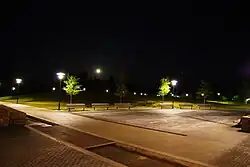Athletic facilities at the park include several fields and courts.[1] Courts include one full-sized basketball court, a half-sized basketball court, two tennis courts, and a beach volleyball court.[1] The fields include one baseball field, four softball fields, and three soccer fields that overlay the softball diamonds' outfields.[1] Memorial Park also includes the only skatepark in the city.[1]