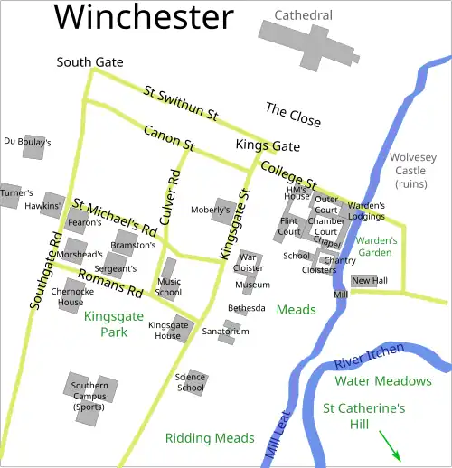 Winchester College football, also known as Winkies, is a code of football played at Winchester College in Hampshire, England. Its rules make it somewhat resemble rugby football but with a round football and little handling of the ball. It was once played in South Africa, but is now restricted to the community directly connected to Winchester College. The game's season is during the spring term from January to March, the second term of the academic year. It developed from an unstructured street game of the 17th century into a standardised sport by the early 19th century. This was first played on the top of St. Catherine's Hill with a line of junior boys down each side to keep the ball from rolling away. The game was moved to the College's playing fields, and the lines of boys were replaced with netting. The main game has teams of 15, but in smaller competitions the teams may be of 10 or 6 players.