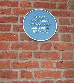 In 1875, the Society of the Holy Child Jesus formed a girls' convent school from the merger of its three convent schools, St. Walburge's of 1853, St Mary's of 1871 and English Martyr's of 1871. The new school was at 23 Winckley Square, the former home of Thomas Batty Addison, once the Recorder of Preston. As the school grew, it came to fill the whole block between the streets of East Cliff and Garden Street, reaching a peak of 850 pupils in 1962. In 1978 it suffered the same fate as the neighbouring Catholic College, the site closing in 1981. The buildings are now used as offices and a Paul Heathcote restaurant.[17]