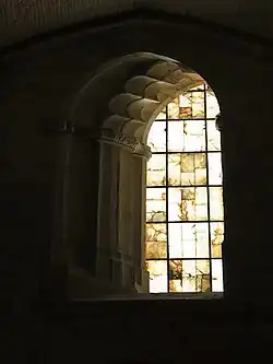 The introduction of lancet windows into Western European church architecture from the 12th century CE built on a tradition of arched windows [10] inserted between columns,[11] and led not only to tracery and elaborate stained-glass windows but also to a long-standing motif of pointed or rounded window-shapes in ecclesiastical buildings, still seen in many churches today.